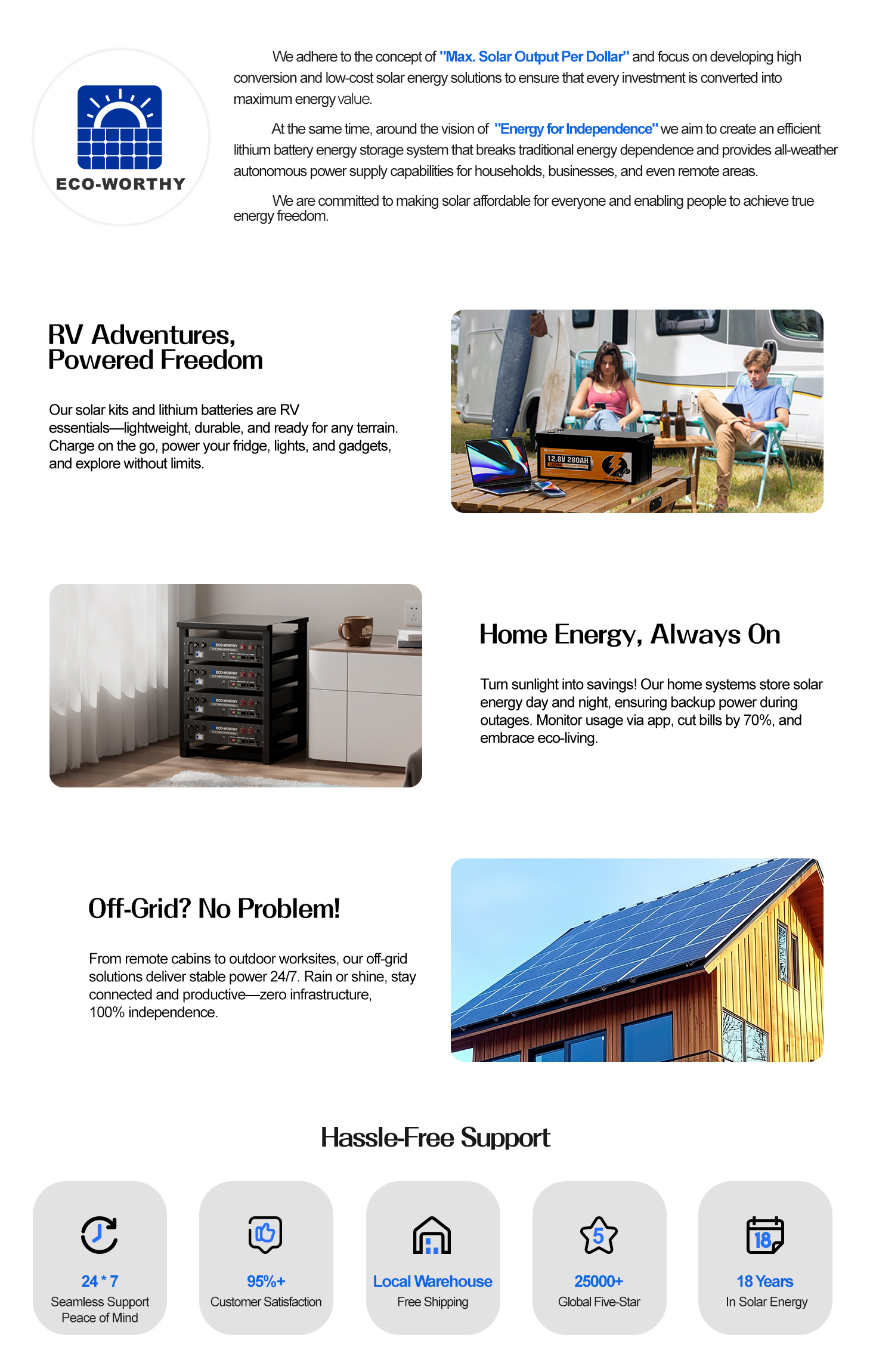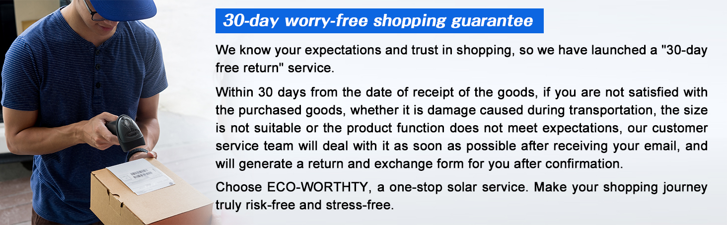 The customer service team provides 24/7 responses. ECO-WORTHY offers exclusive service & lifelong worry-free technical support. Contact us anytime for questions or help—we’re ready to assist